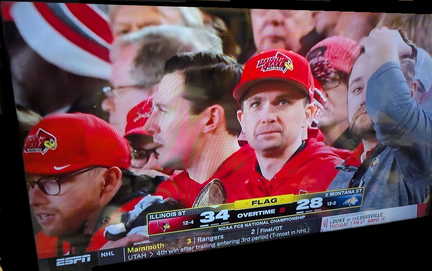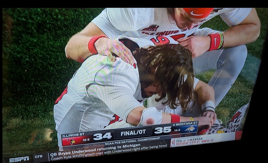 Ironically, Montana State held on to beat Illinois State (heartbreak – pic below) on the BCS State Championship game, Tuesday Jan 5, for the first time since 1984! Illinois State went on a run and came back (to tie) only to miss the extra point, which knifed them in the OT, as Montana State scored a match TD and hit the extra point to win 35-34!