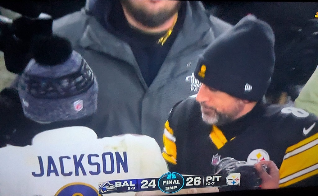 On some luck… first the Steelers kicker choked and missed the extra point in TD with a minute to go to go up 26-24, then the Ravens marched right back down the field but by some twist of fate the Ravens kicker boofed it. Game Over. The Steelers will host wildcard on MNF against the Houston Texans!
